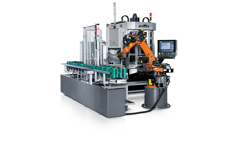 Sunnen VSS-286 with linear-gantry, part separation unit, loading / un­­loading of two parts, double indexing of the rotary table inside the machine, high production solution integrated in transfer line.